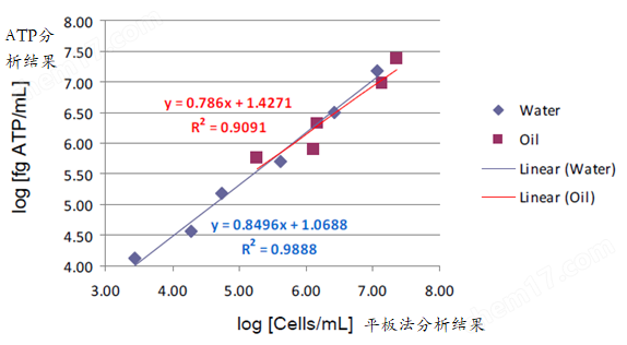 下图所示的实验分别选取了不同微生物浓度的含油样品(红色)和非含油样品(蓝色)进行了平板法和ATP法的测试,然后将2种方式分析的结果进行作图,验证其线性相关性并计算了R2值。从图上我们可以看出ATP和LB培养平板法之间的R2均大于0.9,表明两种分析方法的相关性很强。